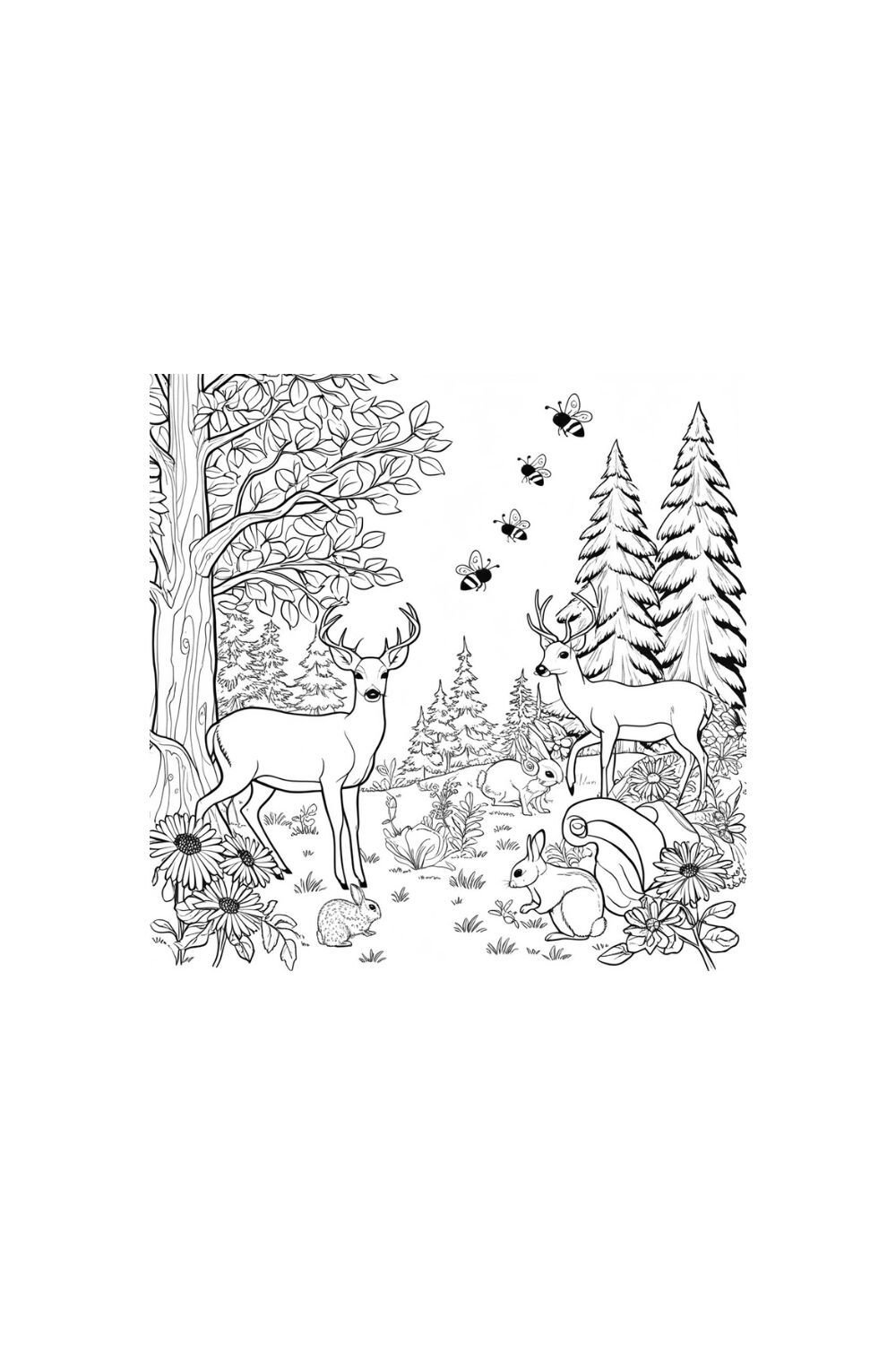 Step into a serene forest wonderland with this enchanting coloring book! Filled with delightful scenes of deer, rabbits, squirrels, butterflies, and buzzing bees in a lush woodland setting, this book invites you to bring these magical moments to life. Perfect for all ages, the intricate details and whimsical designs offer hours of creative relaxation and fun. Whether you're an experienced artist or just looking for a peaceful escape, this coloring book is a perfect way to connect with nature through art.
